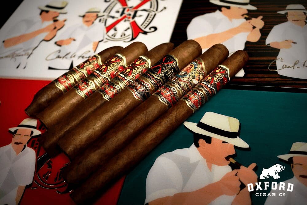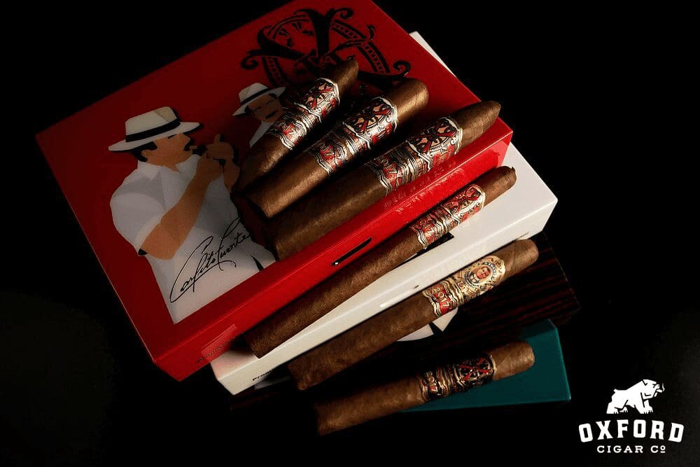 The sampler contains six rare vintage Fuente cigars: OpusX Love Affair, OpusX Magnum O, OpusX Tiger Shark, OpusX Tauros The Bull, Don Arturo Gran AniverXario Churchill, and OpusX Lancero.