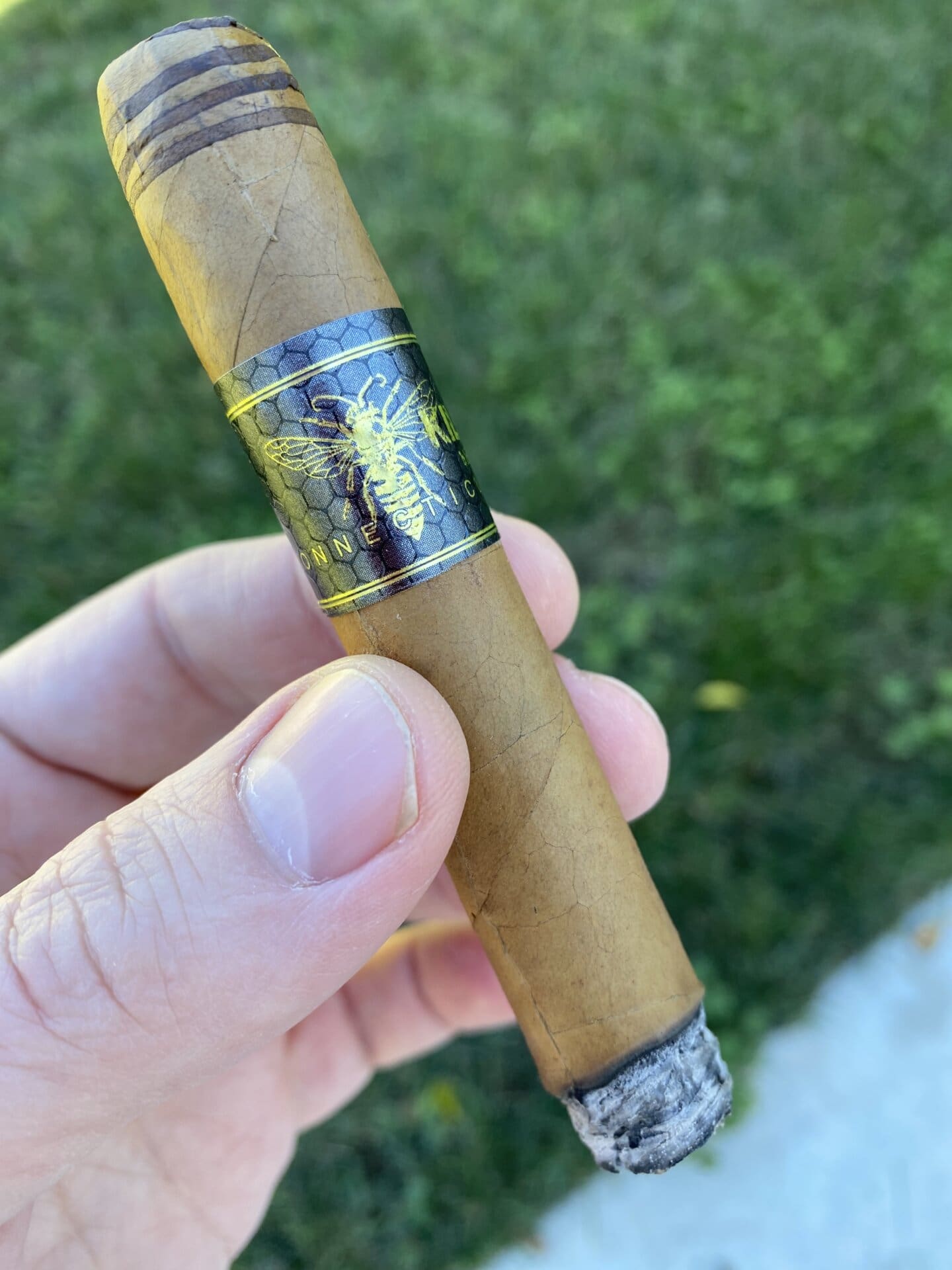 The closed foot seals the filler tobaccos with Ecuadorian maduro leaf, meaning your first puffs pull through dark maduro tobacco before the Connecticut wrapper takes over. The swirl cap alternates Connecticut and maduro leaf in bee like stripes. Both features affect flavor and create the Killer Bee’s distinctive visual identity.