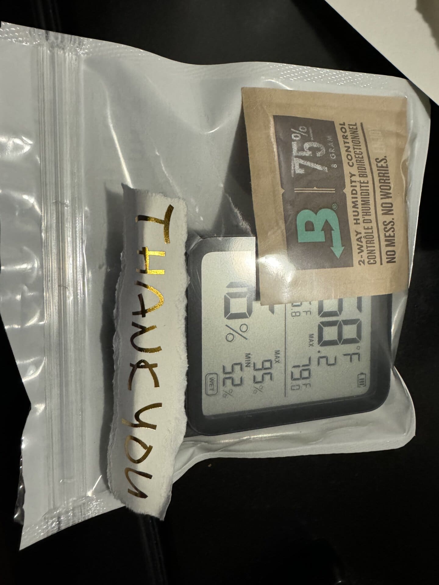 Place your hygrometer in the included zip-seal bag with the 75% Boveda pack. After 24 hours, compare your hygrometer’s reading and adjust as needed.