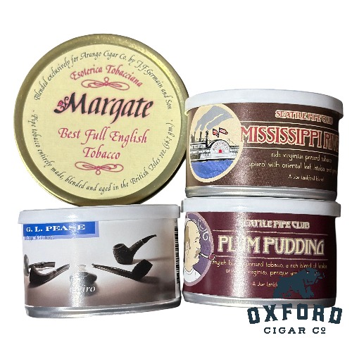 Each bundle includes one 2 ounce tin of Esoterica Margate, one 2 ounce tin of G.L. Pease Cairo, one 2 ounce tin of Seattle Pipe Club Plum Pudding, and one 2 ounce tin of Seattle Pipe Club Mississippi River.