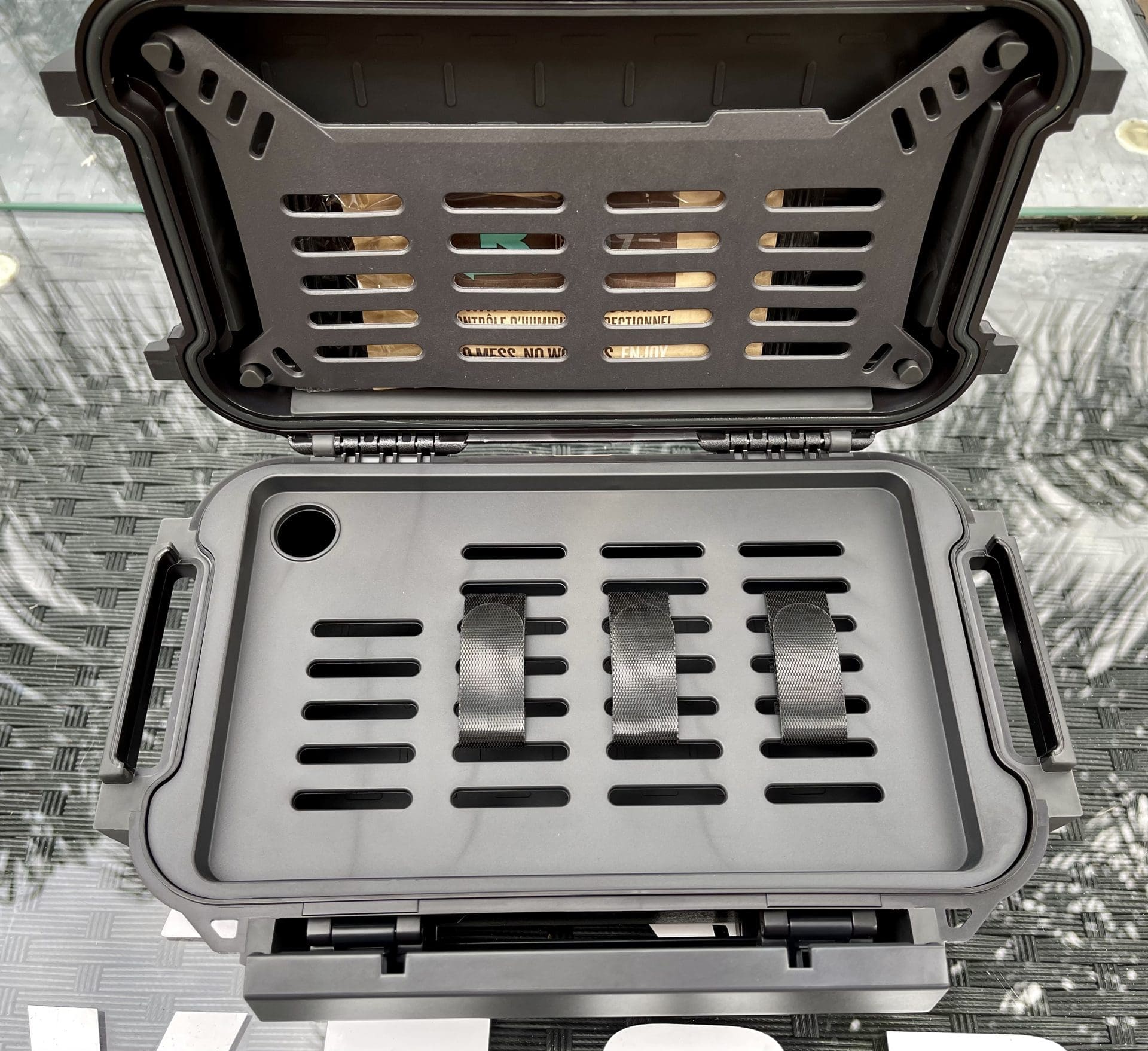 Tested beyond industry standards—buried, thrown in the ocean, chucked off buildings—the Oxford Big Ben Travel Humidor stands up to the demands of any journey. Featuring an abrasion-proof ABS outer shell, dual pivot hinge latch, and waterproof IP68-rated seal, your cigars remain protected from the elements no matter where you roam. The MOLLE system, snap-in lid organizer, and included divider tray keep accessories, lighters, or cutters securely in place, while the built-in pressure valve keeps contents fresh by balancing air pressure and blocking out water and dust.