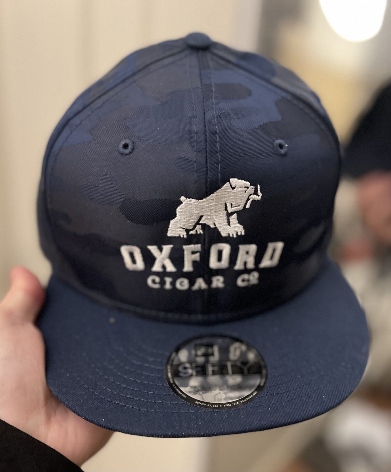 Elevate your style with the Oxford Blue Camo FIFTY Snapback—a blend of classic branding and modern design for the discerning cigar enthusiast. Crafted by 9Fifty for exceptional comfort and durability, this stylish cap features a traditional white Oxford Bulldog logo embroidered on the front and a bold bulldog emblem at the back. The woven blue camo pattern brings subtle visual intrigue, shimmering under certain lights while remaining classy and understated for everyday wear.