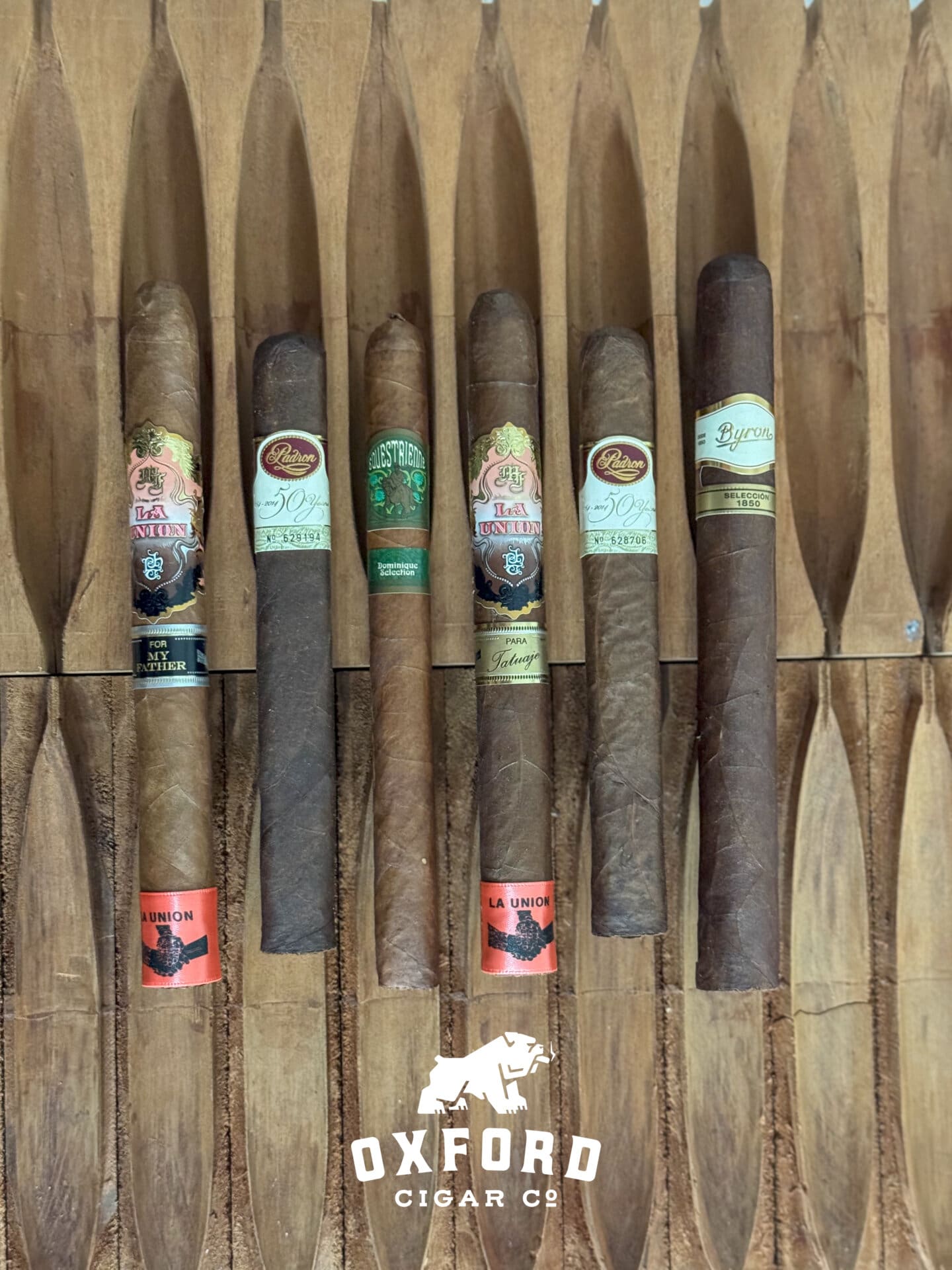 This sampler features exclusive and limited edition cigars including the Oxford-exclusive Casdagli Equestrienne, Padron 50th anniversary editions, and the rare My Father & Tatuaje collaboration, offering access to cigars not commonly available individually.