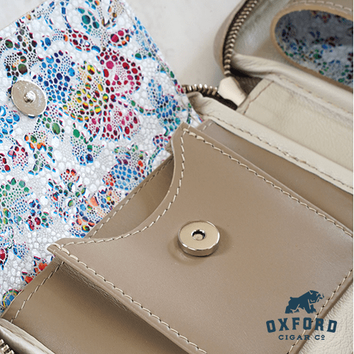 Every feature is designed with the aficionado in mind: securely store cigars, keep your lighter and cutter at hand, and enjoy fast access to devices or small items with the strategic slip pocket and handle. The durable leather-wrapped metal guardian ensures your cigars stay safe and fresh, while magnetic closures mean nothing goes astray.