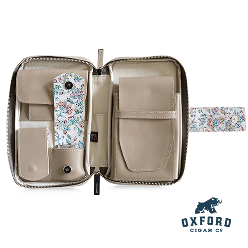 - Main pouch, lined with leather-wrapped metal guardian, stores 5–6 cigars (up to 7.5″ long, 60 ring gauge)