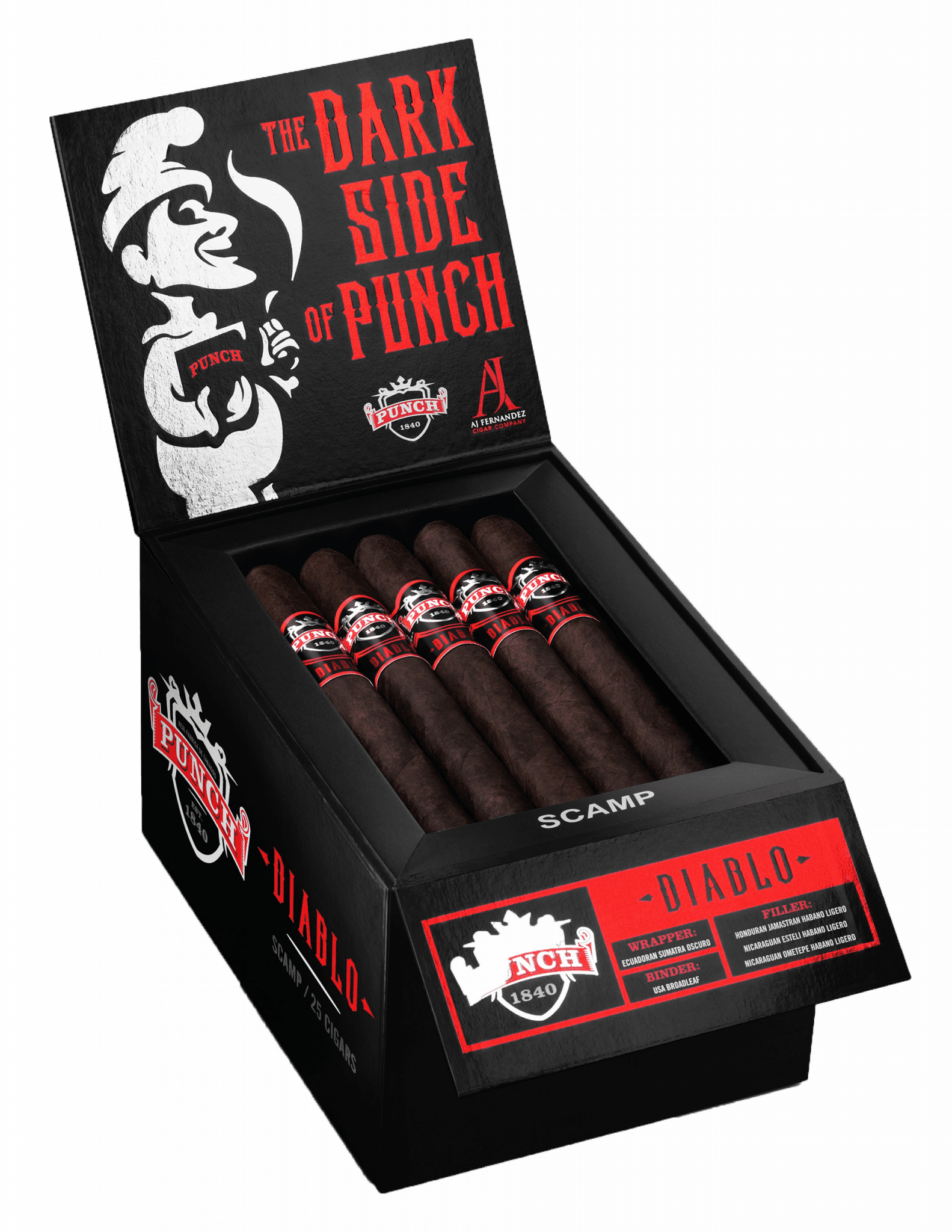 Punch Diablo marks a bold new era for the legendary Punch brand—crafted in Nicaragua under the expertise of AJ Fernandez, this full-bodied cigar is the first in the Punch lineup to be produced outside of Honduras. Enrobed in a super-dark Ecuadorian Sumatra Oscuro wrapper and featuring a hearty Connecticut Broadleaf binder with aged Honduran and Nicaraguan fillers, Punch Diablo delivers a flavor-packed journey suited for seasoned connoisseurs and adventurous palates alike.