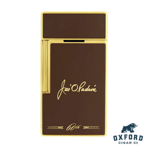 The lighter celebrates Padrón’s 60th anniversary with a design inspired by the brand’s iconic wrapper color and cigar band, combining matte brown lacquer with yellow gold accents.