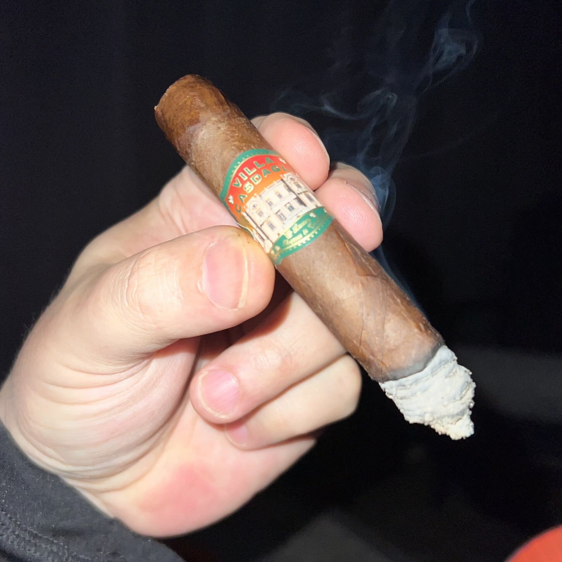 Villa Casdagli Corona Gorda is a fantastic medium bodied cigar. This vitola is a classic 5.6″x46 and boasts a reddish brown Ecuadorian wrapper over light and dark leaf fillers from the Dominican Republic, Nicaragua, Peru, and Ecuador. Pre-light draw has notes of raisin, caramel, and pecan. After lighting there was some concern it was going to burn too quickly due to the first few puffs behaving as though the cigar was rolled loosely, but it tightened up pleasantly. The roasted pecan notes are definitely dominant in the first third, almost like a pecan shortbread, but not overly sweet. There’s more cafe con leche and leather notes in the second third, with a creamy finish on the palate. The last third has some more organic notes of hay and there’s a woodiness like oak that remains between draws. I like the way Casdagli cigars transition in flavors as they are smoked. I would buy and smoke this one again.